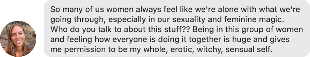 Capping the program ensures I can work with each woman 1:1 in the live sessions. It’s like having private mentorship with me + the benefits of a group of women who are on the same path as you.I’m also available inbetween our sessions in an exclusive Erotic Initiation only support group with just the women in this program.